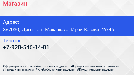 Магазин по адресу 367030, Дагестан, Махачкала, Ирчи Казака, 49/45 в дальнейшем Организация, размещена в следующих категориях: