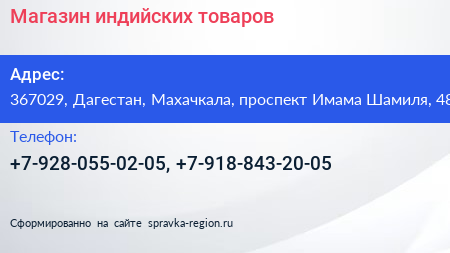 Магазин индийских товаров по адресу 367029, Дагестан, Махачкала, проспект Имама Шамиля, 48 в дальнейшем Организация, размещена в следующих категориях: