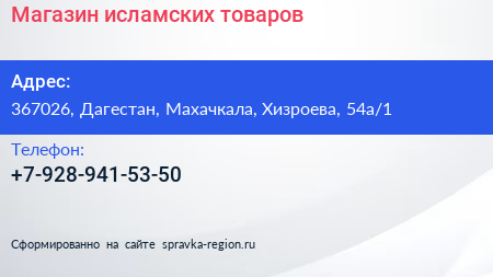 Магазин исламских товаров по адресу 367026, Дагестан, Махачкала, Хизроева, 54а/1 в дальнейшем Организация, размещена в следующих категориях: