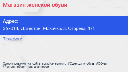 Магазин женской обуви по адресу 367014, Дагестан, Махачкала, Огарёва, 1/1 в дальнейшем Организация, размещена в следующих категориях:
