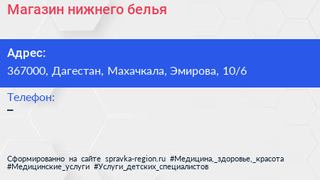 Магазин нижнего белья по адресу 367000, Дагестан, Махачкала, Эмирова, 10/6 в дальнейшем Организация, размещена в следующих категориях: