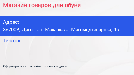 Магазин товаров для обуви по адресу 367009, Дагестан, Махачкала, Магомедтагирова, 45 в дальнейшем Организация, размещена в следующих категориях: