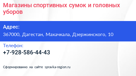 Магазины спортивных сумок и головных уборов по адресу 367000, Дагестан, Махачкала, Дзержинского, 10 в дальнейшем Организация, размещена в следующих категориях: