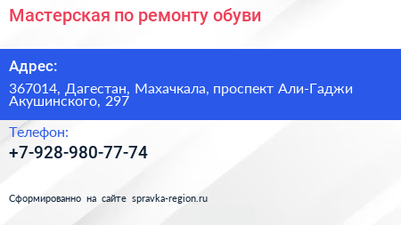 Мастерская по ремонту обуви по адресу 367014, Дагестан, Махачкала, проспект Али-Гаджи Акушинского, 297 в дальнейшем Организация, размещена в следующих категориях: