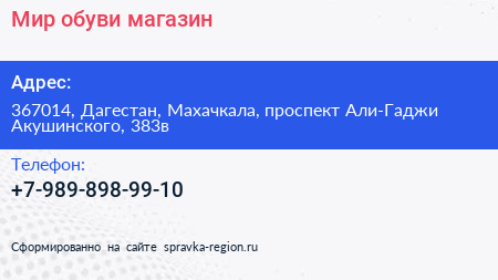 Мир обуви, магазин по адресу 367014, Дагестан, Махачкала, проспект Али-Гаджи Акушинского, 383в в дальнейшем Организация, размещена в следующих категориях: