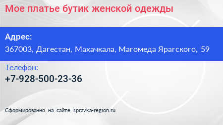 Мое платье, бутик женской одежды по адресу 367003, Дагестан, Махачкала, Магомеда Ярагского, 59 в дальнейшем Организация, размещена в следующих категориях:
