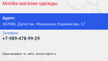 Monika, магазин одежды по адресу 367000, Дагестан, Махачкала, Коркмасова, 17 в дальнейшем Организация, размещена в следующих категориях: