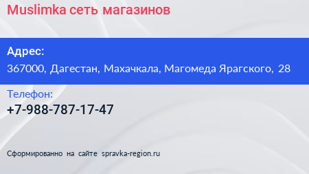 Muslimka, сеть магазинов по адресу 367000, Дагестан, Махачкала, Магомеда Ярагского, 28 в дальнейшем Организация, размещена в следующих категориях: