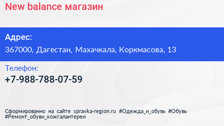 New balance, магазин по адресу 367000, Дагестан, Махачкала, Коркмасова, 13 в дальнейшем Организация, размещена в следующих категориях: