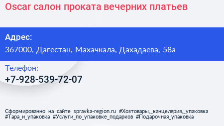 Oscar, салон проката вечерних платьев по адресу 367000, Дагестан, Махачкала, Дахадаева, 58а в дальнейшем Организация, размещена в следующих категориях: