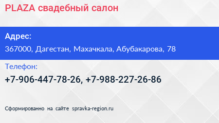 PLAZA, свадебный салон по адресу 367000, Дагестан, Махачкала, Абубакарова, 78 в дальнейшем Организация, размещена в следующих категориях: