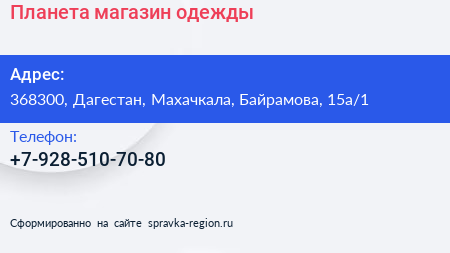 Планета, магазин одежды по адресу 368300, Дагестан, Махачкала, Байрамова, 15а/1 в дальнейшем Организация, размещена в следующих категориях: