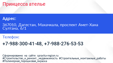 Принцесса, ателье по адресу 367010, Дагестан, Махачкала, проспект Амет-Хана Султана, 6/1 в дальнейшем Организация, размещена в следующих категориях: