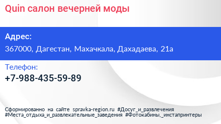 Quin, салон вечерней моды по адресу 367000, Дагестан, Махачкала, Дахадаева, 21а в дальнейшем Организация, размещена в следующих категориях: