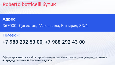 Roberto botticelli, бутик по адресу 367000, Дагестан, Махачкала, Батырая, 33/1 в дальнейшем Организация, размещена в следующих категориях: