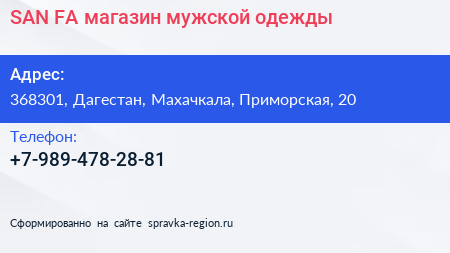 SAN & FA, магазин мужской одежды по адресу 368301, Дагестан, Махачкала, Приморская, 20 в дальнейшем Организация, размещена в следующих категориях: