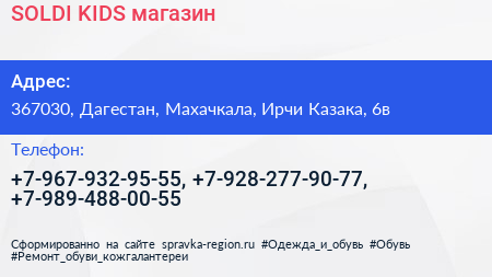 SOLDI KIDS, магазин по адресу 367030, Дагестан, Махачкала, Ирчи Казака, 6в в дальнейшем Организация, размещена в следующих категориях: