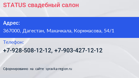 STATUS, свадебный салон по адресу 367000, Дагестан, Махачкала, Коркмасова, 54/1 в дальнейшем Организация, размещена в следующих категориях: