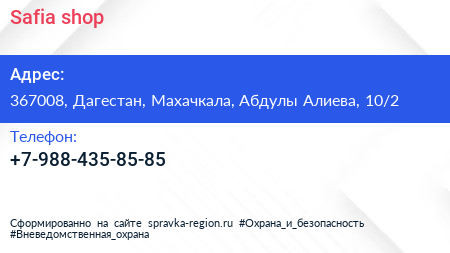 Safia shop по адресу 367008, Дагестан, Махачкала, Абдулы Алиева, 10/2 в дальнейшем Организация, размещена в следующих категориях: