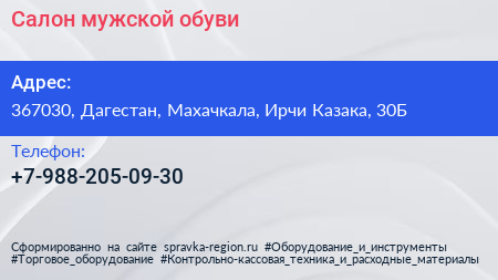 Салон мужской обуви по адресу 367030, Дагестан, Махачкала, Ирчи Казака, 30Б в дальнейшем Организация, размещена в следующих категориях: