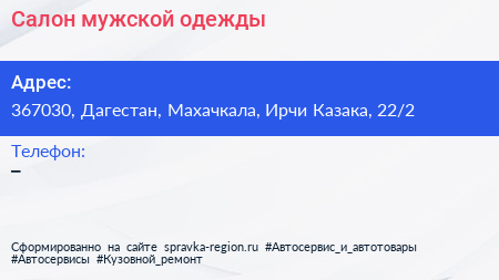 Салон мужской одежды по адресу 367030, Дагестан, Махачкала, Ирчи Казака, 22/2 в дальнейшем Организация, размещена в следующих категориях: