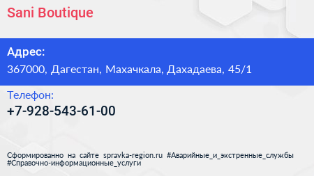 Sani Boutique по адресу 367000, Дагестан, Махачкала, Дахадаева, 45/1 в дальнейшем Организация, размещена в следующих категориях: