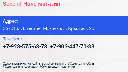 Second Hand, магазин по адресу 367013, Дагестан, Махачкала, Крылова, 20 в дальнейшем Организация, размещена в следующих категориях: