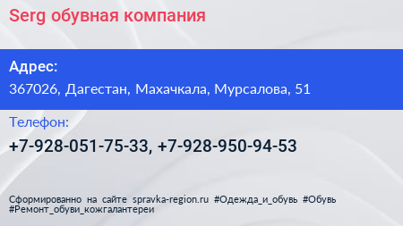 Serg, обувная компания по адресу 367026, Дагестан, Махачкала, Мурсалова, 51 в дальнейшем Организация, размещена в следующих категориях: