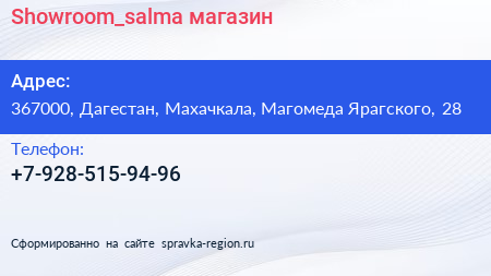 Showroom_salma, магазин по адресу 367000, Дагестан, Махачкала, Магомеда Ярагского, 28 в дальнейшем Организация, размещена в следующих категориях: