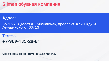 Slimen, обувная компания по адресу 367027, Дагестан, Махачкала, проспект Али-Гаджи Акушинского, 30/13 в дальнейшем Организация, размещена в следующих категориях: