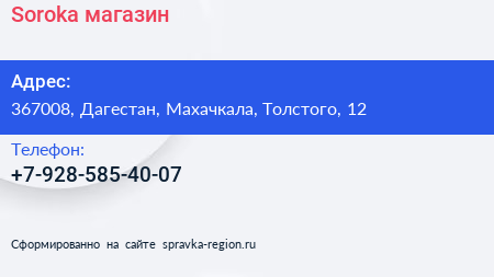 Soroka, магазин по адресу 367008, Дагестан, Махачкала, Толстого, 12 в дальнейшем Организация, размещена в следующих категориях: