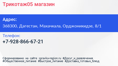 Трикотаж05, магазин по адресу 368300, Дагестан, Махачкала, Орджоникидзе, 8/1 в дальнейшем Организация, размещена в следующих категориях: