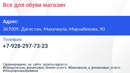 Все для обуви, магазин по адресу 367009, Дагестан, Махачкала, Мирзабекова, 90 в дальнейшем Организация, размещена в следующих категориях: