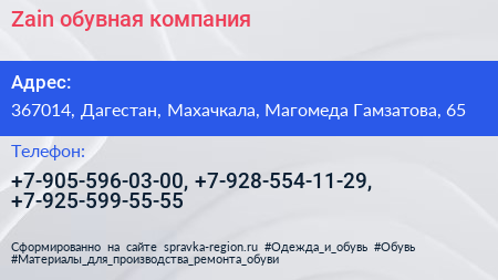 Zain, обувная компания по адресу 367014, Дагестан, Махачкала, Магомеда Гамзатова, 65 в дальнейшем Организация, размещена в следующих категориях: