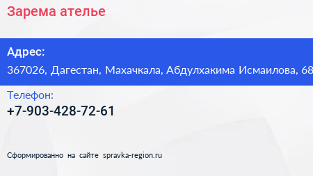 Зарема, ателье по адресу 367026, Дагестан, Махачкала, Абдулхакима Исмаилова, 68 в дальнейшем Организация, размещена в следующих категориях: