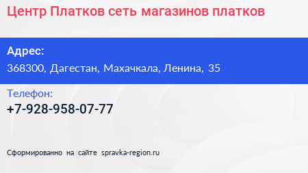 Центр Платков, сеть магазинов платков по адресу 368300, Дагестан, Махачкала, Ленина, 35 в дальнейшем Организация, размещена в следующих категориях: