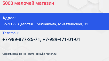 5000 мелочей, магазин по адресу 367006, Дагестан, Махачкала, Миатлинская, 31 в дальнейшем Организация, размещена в следующих категориях: