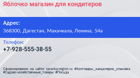 Яблочко, магазин для кондитеров по адресу 368300, Дагестан, Махачкала, Ленина, 54а в дальнейшем Организация, размещена в следующих категориях: