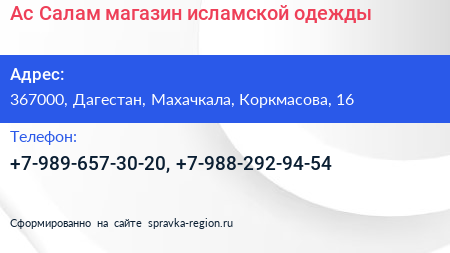 Ас-Салам, магазин исламской одежды по адресу 367000, Дагестан, Махачкала, Коркмасова, 16 в дальнейшем Организация, размещена в следующих категориях: