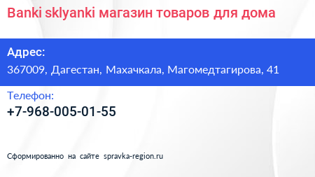 Banki sklyanki, магазин товаров для дома по адресу 367009, Дагестан, Махачкала, Магомедтагирова, 41 в дальнейшем Организация, размещена в следующих категориях: