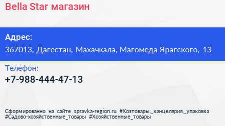 Bella Star, магазин по адресу 367013, Дагестан, Махачкала, Магомеда Ярагского, 13 в дальнейшем Организация, размещена в следующих категориях:
