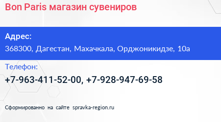 Bon Paris, магазин сувениров по адресу 368300, Дагестан, Махачкала, Орджоникидзе, 10а в дальнейшем Организация, размещена в следующих категориях: