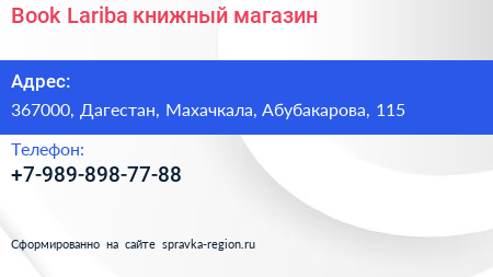 Book Lariba, книжный магазин по адресу 367000, Дагестан, Махачкала, Абубакарова, 115 в дальнейшем Организация, размещена в следующих категориях: