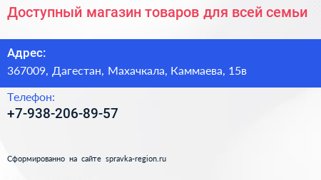 Доступный, магазин товаров для всей семьи по адресу 367009, Дагестан, Махачкала, Каммаева, 15в в дальнейшем Организация, размещена в следующих категориях: