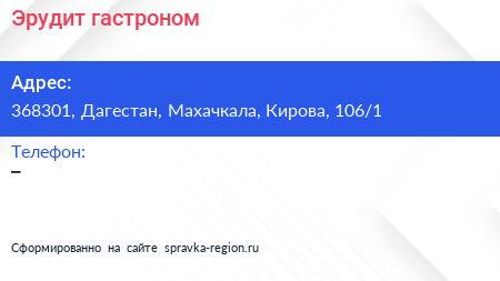 Эрудит, гастроном по адресу 368301, Дагестан, Махачкала, Кирова, 106/1 в дальнейшем Организация, размещена в следующих категориях: