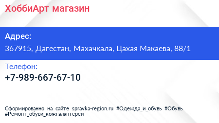 ХоббиАрт, магазин по адресу 367915, Дагестан, Махачкала, Цахая Макаева, 88/1 в дальнейшем Организация, размещена в следующих категориях: