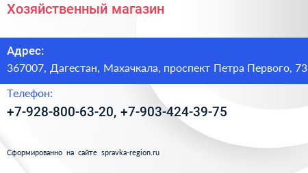 Хозяйственный магазин по адресу 367007, Дагестан, Махачкала, проспект Петра Первого, 73 в дальнейшем Организация, размещена в следующих категориях: