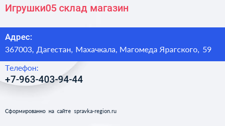 Игрушки05, склад-магазин по адресу 367003, Дагестан, Махачкала, Магомеда Ярагского, 59 в дальнейшем Организация, размещена в следующих категориях: