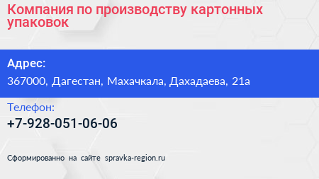 Компания по производству картонных упаковок по адресу 367000, Дагестан, Махачкала, Дахадаева, 21а в дальнейшем Организация, размещена в следующих категориях: