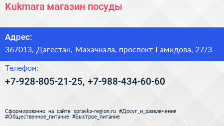 Kukmara, магазин посуды по адресу 367013, Дагестан, Махачкала, проспект Гамидова, 27/3 в дальнейшем Организация, размещена в следующих категориях: